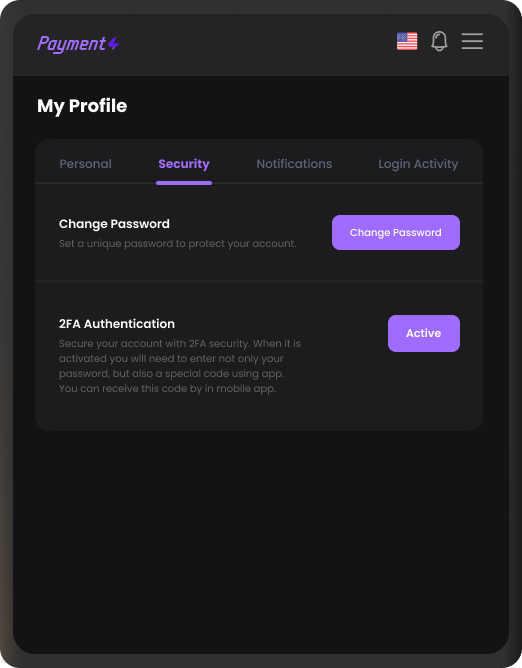 Implement robust encryption to secure user private keys, restricting access. Enhance account security with Two-Factor Authentication (2FA) Setup, allowing merchants to add an extra layer of protection to their Payment4 accounts.